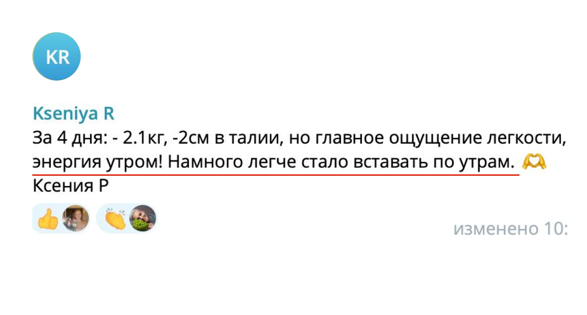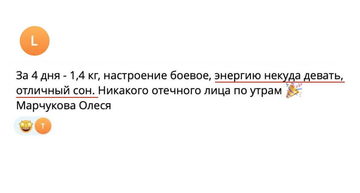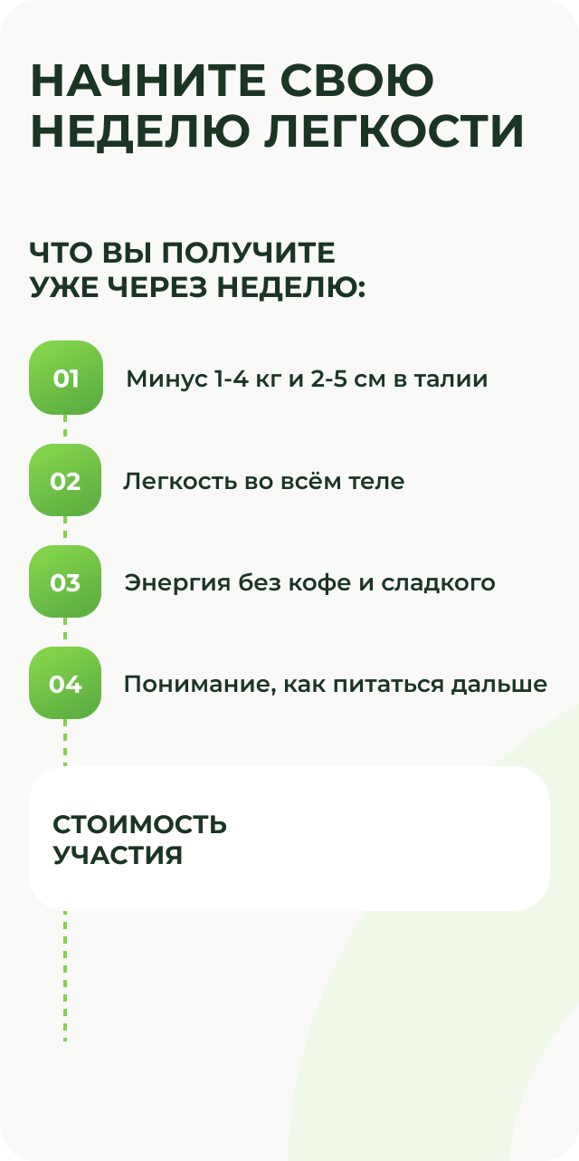 Мы уверены в методе. Если вы пройдёте все 7 дней по программе, выполните все задания — и не почувствуете ни лёгкости, ни улучшения самочувствия — мы вернём 100% оплаты.