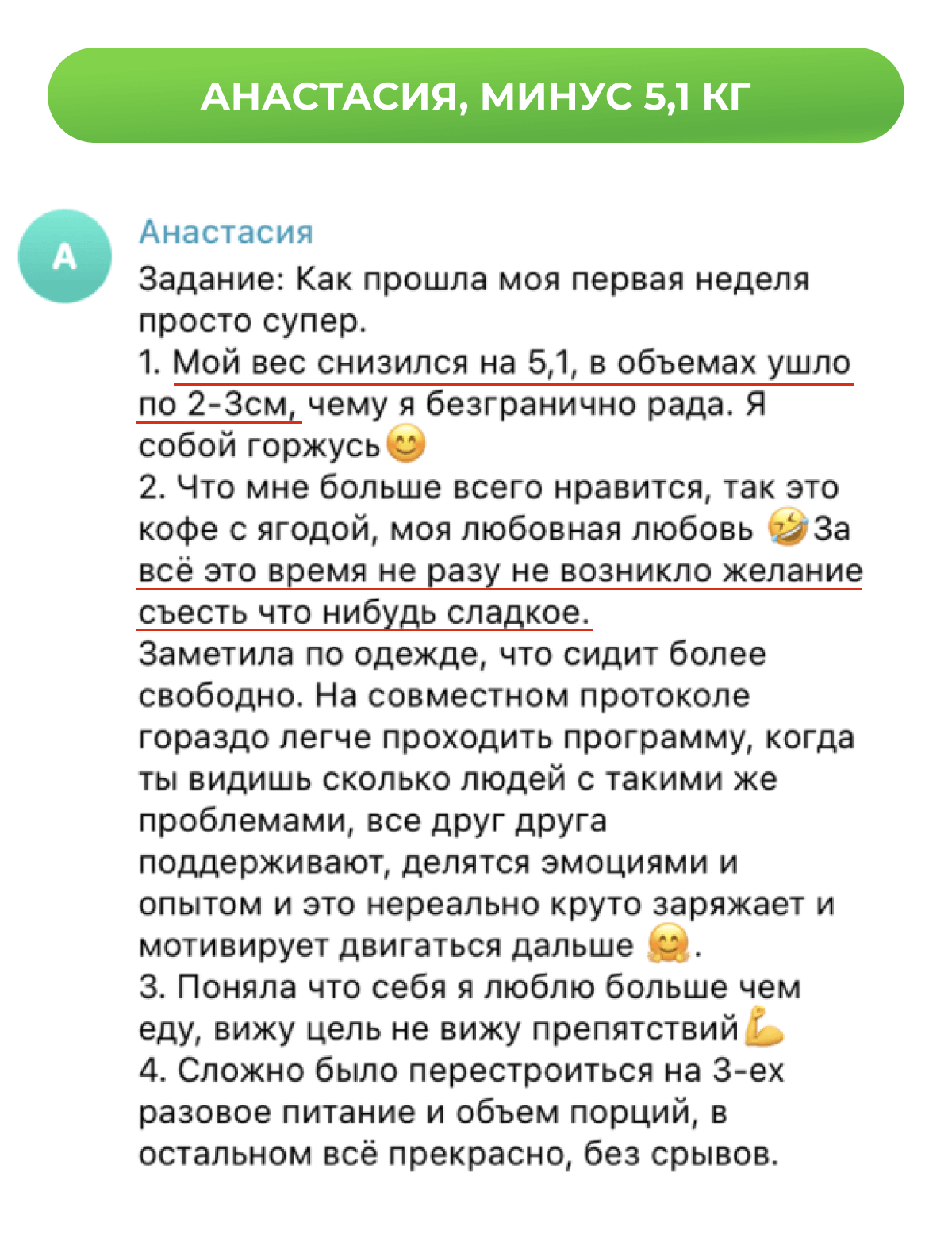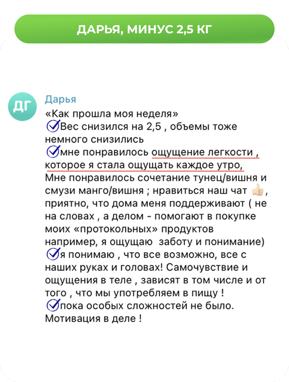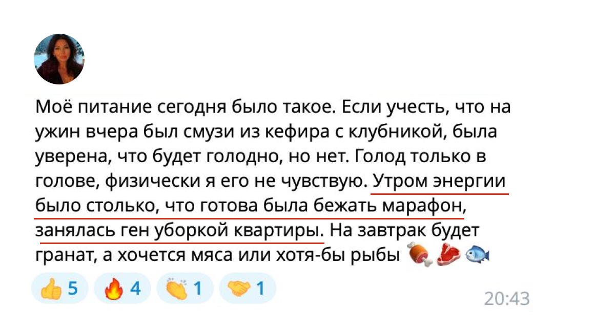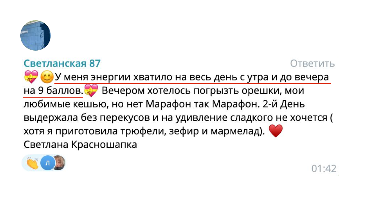 Присылать отчеты, следовать меню, выполнять задания. Если после этого результата нет — напишите нам в течение 48 часов после окончания марафона.