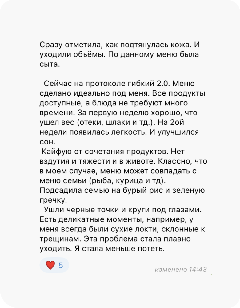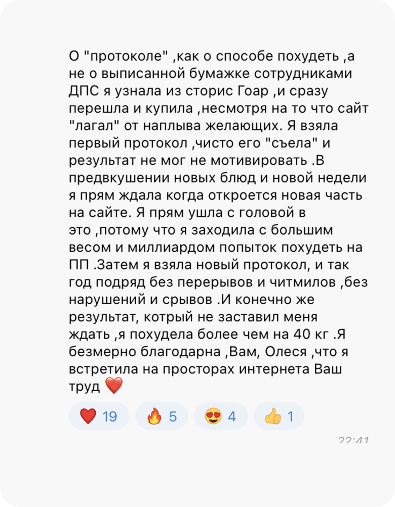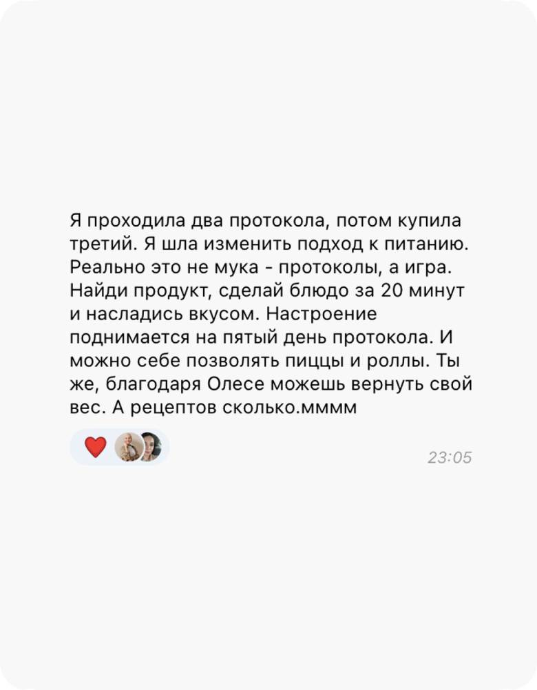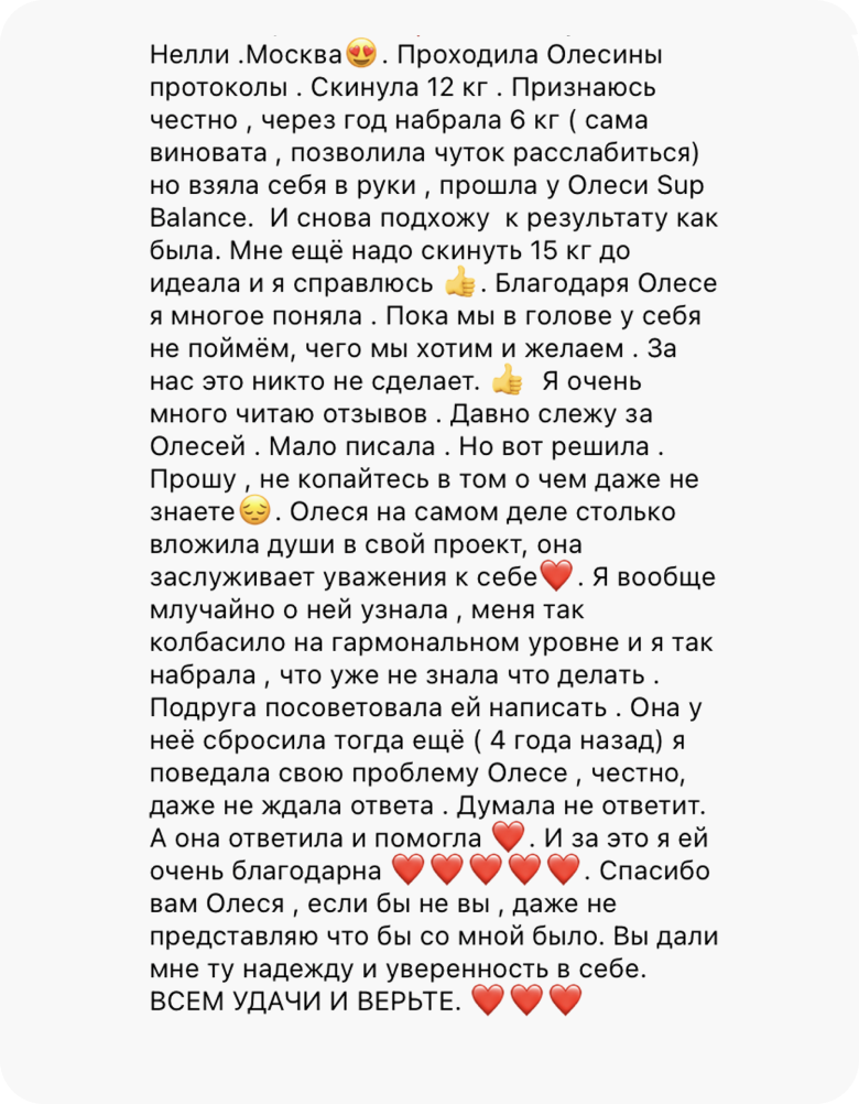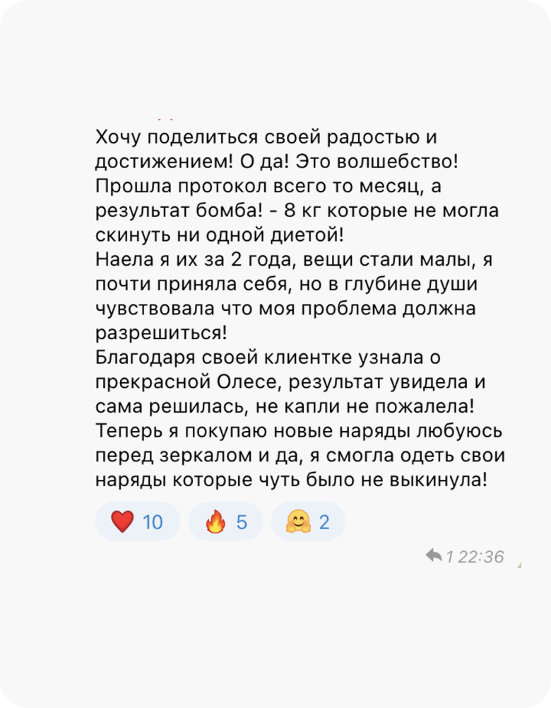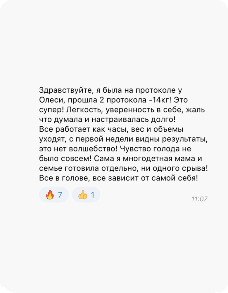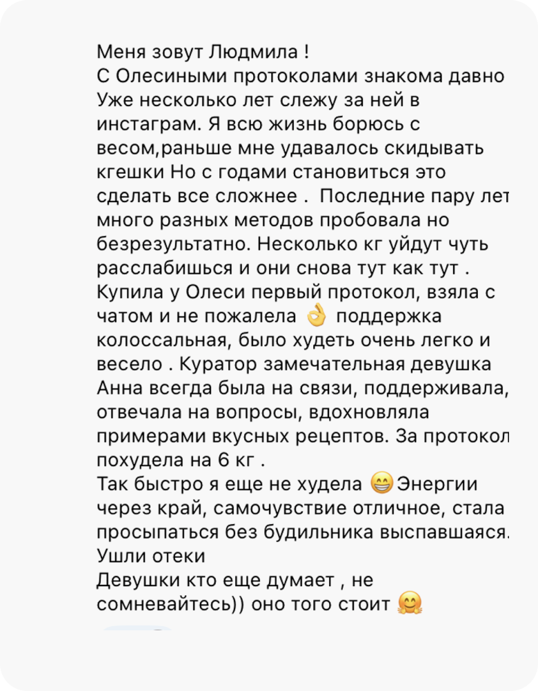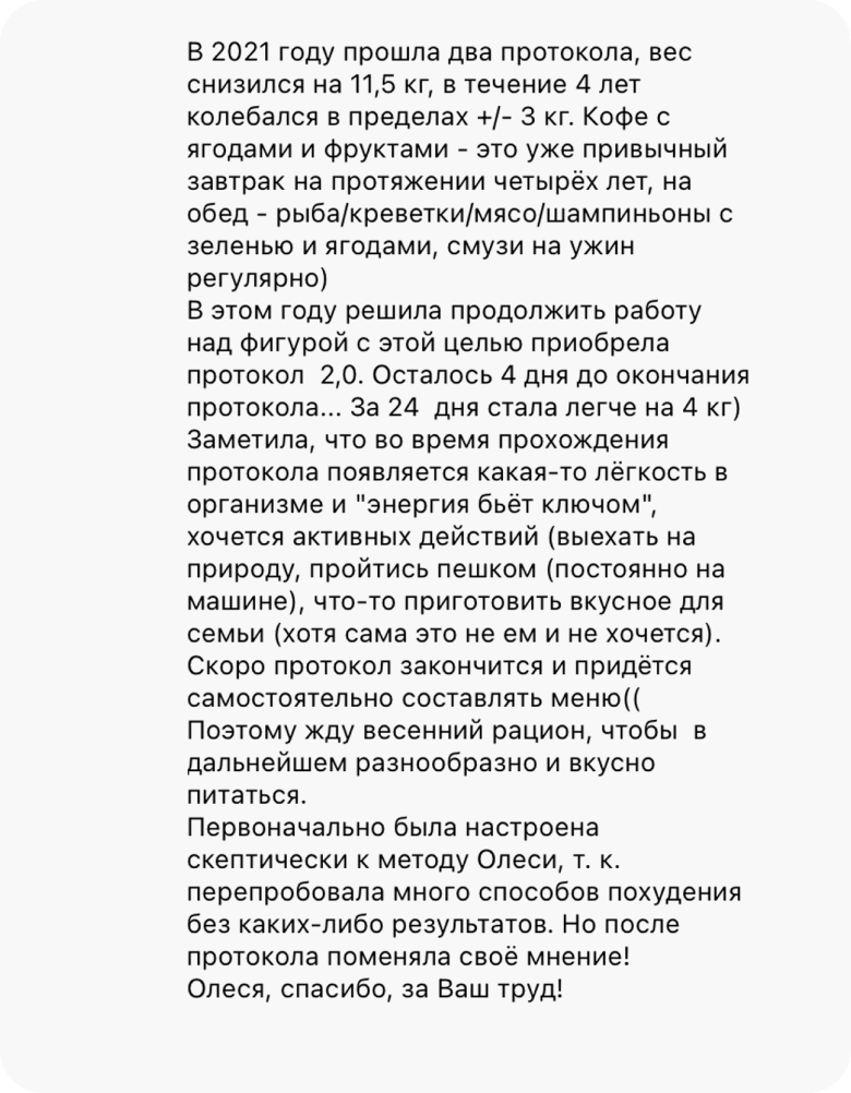 Это исключено. У нас нет ни одного клиента, который, следуя протоколу, не похудел бы минимум на 4 кг. Худеют все, независимо от возраста, гормонального фона, стресса, лекарств и прочих стоп-факторов. А если будете худеть медленно, Олеся скорректирует ваш протокол, чтобы динамика снижения веса за 4 недели составила 4-8 кг.
